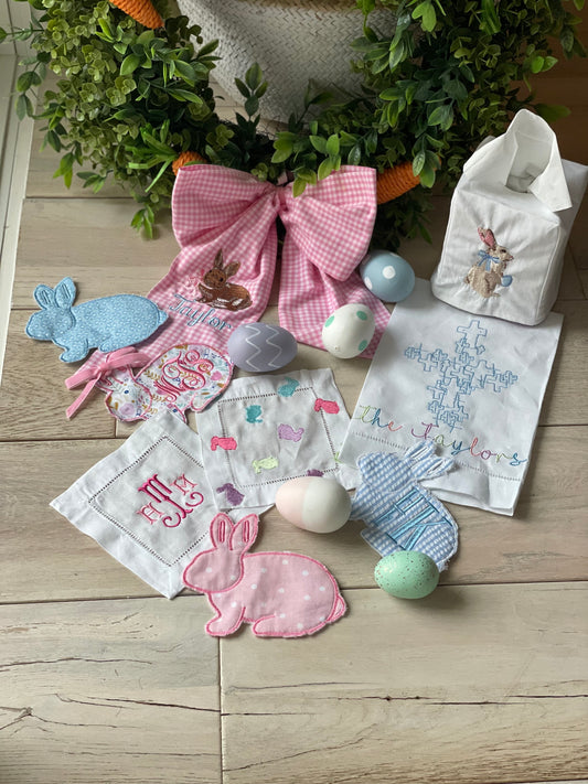 Celebrate Easter in style with our embroidered collection! From chic basket sashes to charming cocktail napkins, add elegance to every detail.