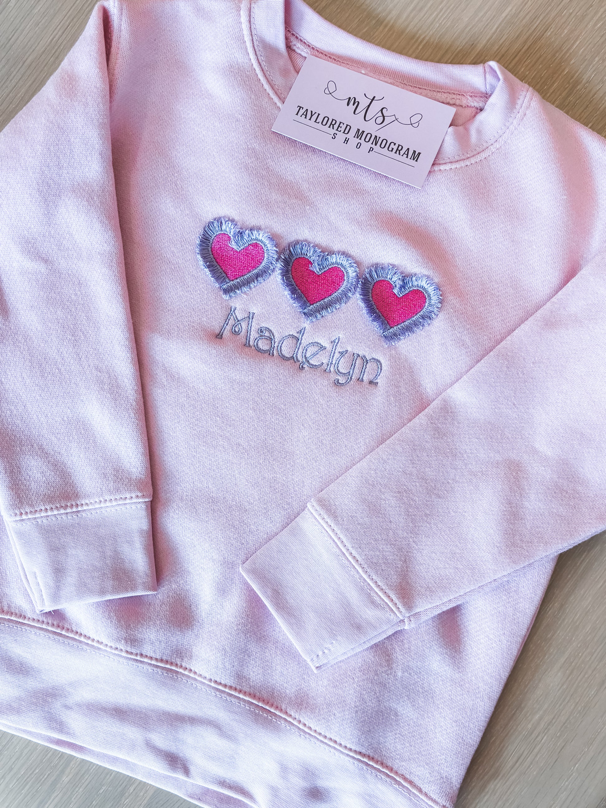 Fleece crewneck sweatshirt adorned with fuzzy hearts and personalized for your little valentine.